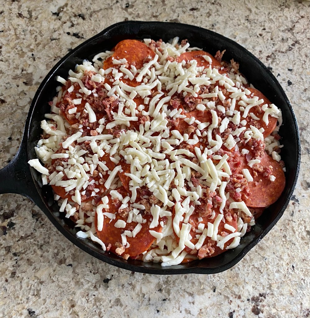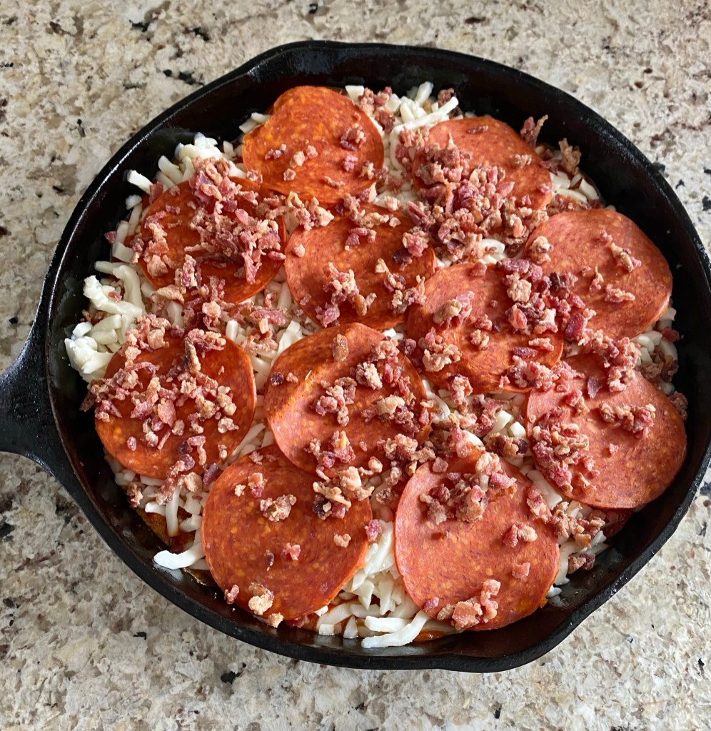 This is a delicious low carb crustless pizza! It’s an easy one skillet meal. Here’s my recipe:
