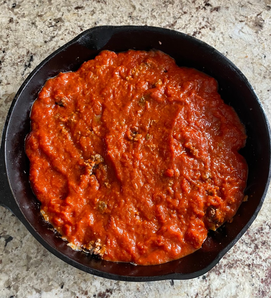 Top ground beef with marinara sauce. I use Rao’s sauce, it is low in carbs then most and it is very fresh tasting. I use a whole jar, we like it saucy.