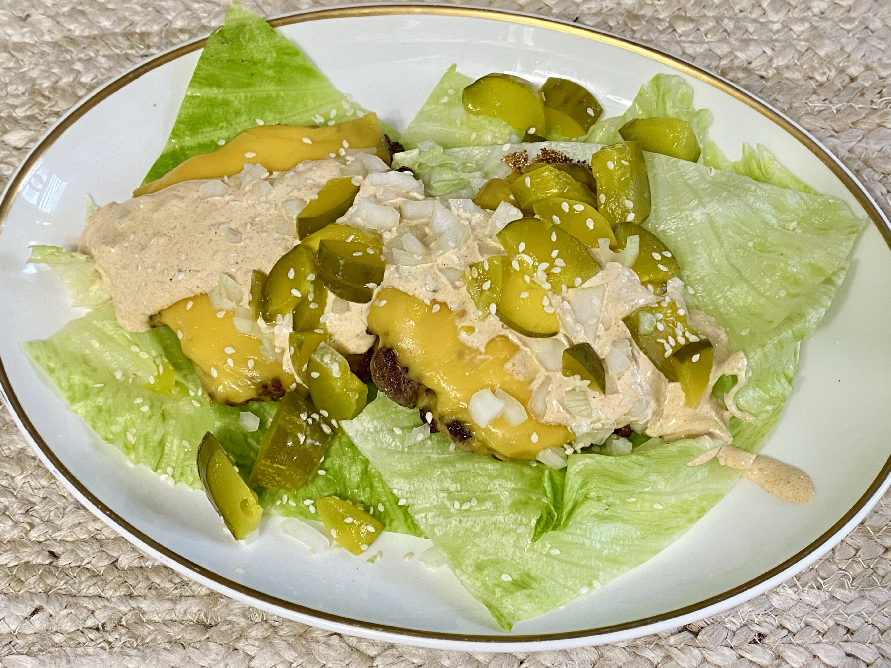 Make four hamburger patties, season with salt and pepper. Fry or grill burgers until desired doneness. Melt cheese on top of burgers. Divide lettuce between two plates and place two patties onto each bed of lettuce. Top with onions and pickles. Spread two tablespoons of sauce across burgers. Sprinkle sesame seeds over salad and enjoy!