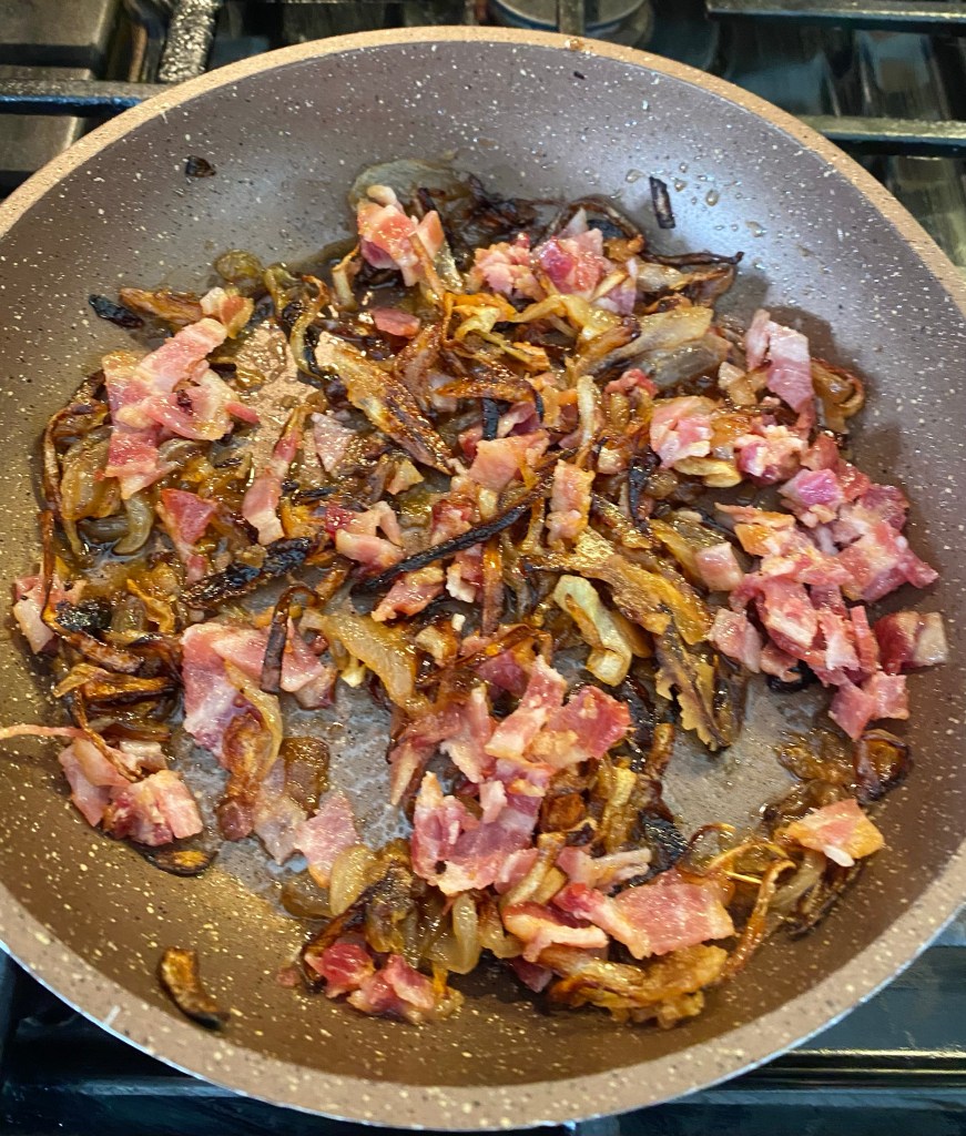 Add onions, bacon and a pinch of salt. Sauté slowly until onions are caramelized.