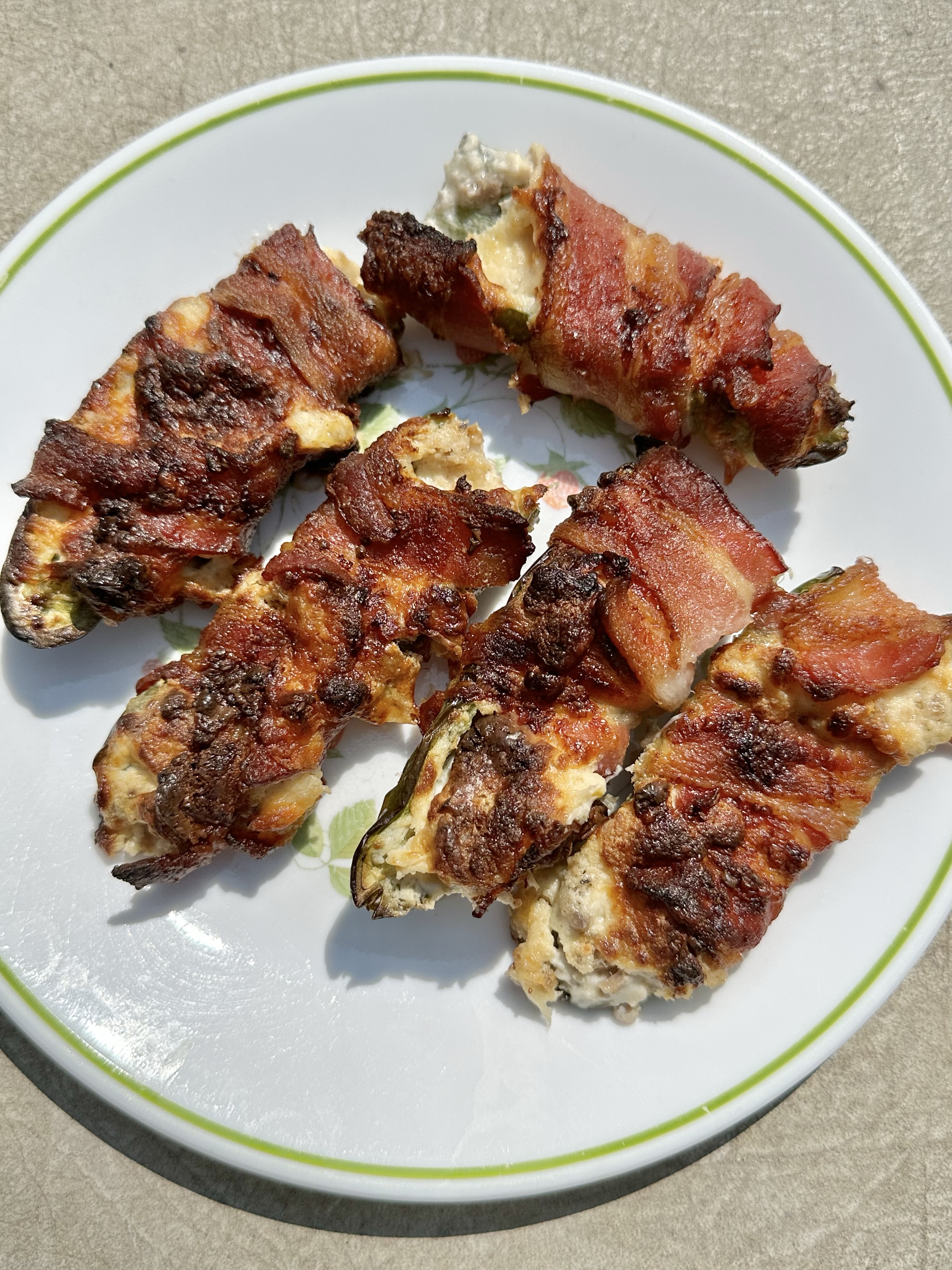 Mix cream cheese, pepper jack, meat, garlic, salt and hot sauce together in a small bowl. Scoop mixture into each jalapeño half. Wrap in bacon. Bake in oven or air fryer at 375 for 20-24 minutes.