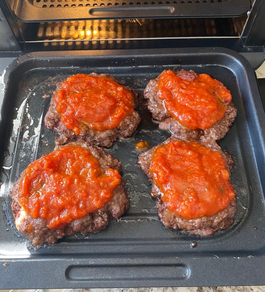 I took 1 lb of ground hamburger and mixed in 1/2 tsp salt, 1/2 tsp pepper and 1 tsp Italian seasoning, then formed them into four burgers. Bake them in the air fryer at 375 degrees for 8-10 minutes depending on desired doneness.