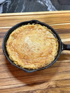 Mix all ingredients together. Grease a 6.5″ small iron skillet with butter. Pour batter into skillet. bake in preheated oven 350 degree oven for 14-16 minutes.