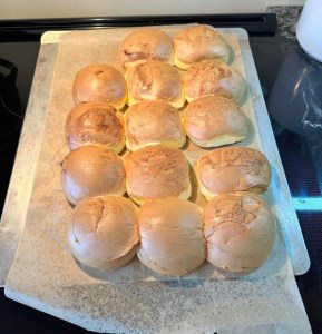 Cover a baking sheet with parchment paper and spray with nonstick oil. You can spray your scoop (1/4 cup, 2 Tbsp, 2 oz scoop!) with oil, inside and out. Scoop batter onto the pan with the rolls barely touching. Bake at 325 for 15 minutes then turn off the oven. Set a timer for at least 15 minutes and let them sit in the oven till it goes off.