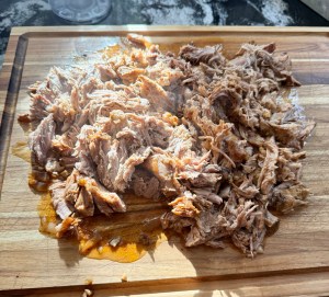 Place all ingredients into a slow cooker. Set time to 10 hours on low. Slow cook until meat shreds apart easily.