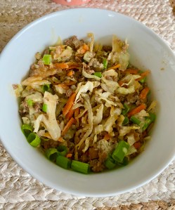 Brown ground beef along with onions in a large skillet on the stovetop. Add oil, salt, garlic and ginger. Stir for about one minute. Add Tamari sauce, rice vinegar and coleslaw mix. Stir and cook until slaw is soft or desired texture. Top with green onions.