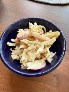 Mix slaw with sesame seeds in a mixing bowl. Set aside. Mix all other ingredients together very well, in a small bowl and pour over slaw. Mix well and refrigerate until ready to serve.